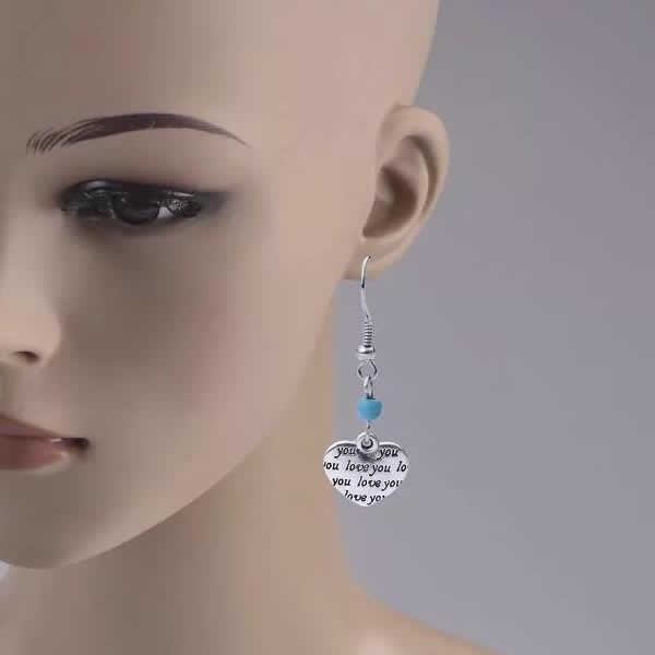 ハートにラブメッセージをデザインしトルコ石をセットしたボヘミアンピアス。